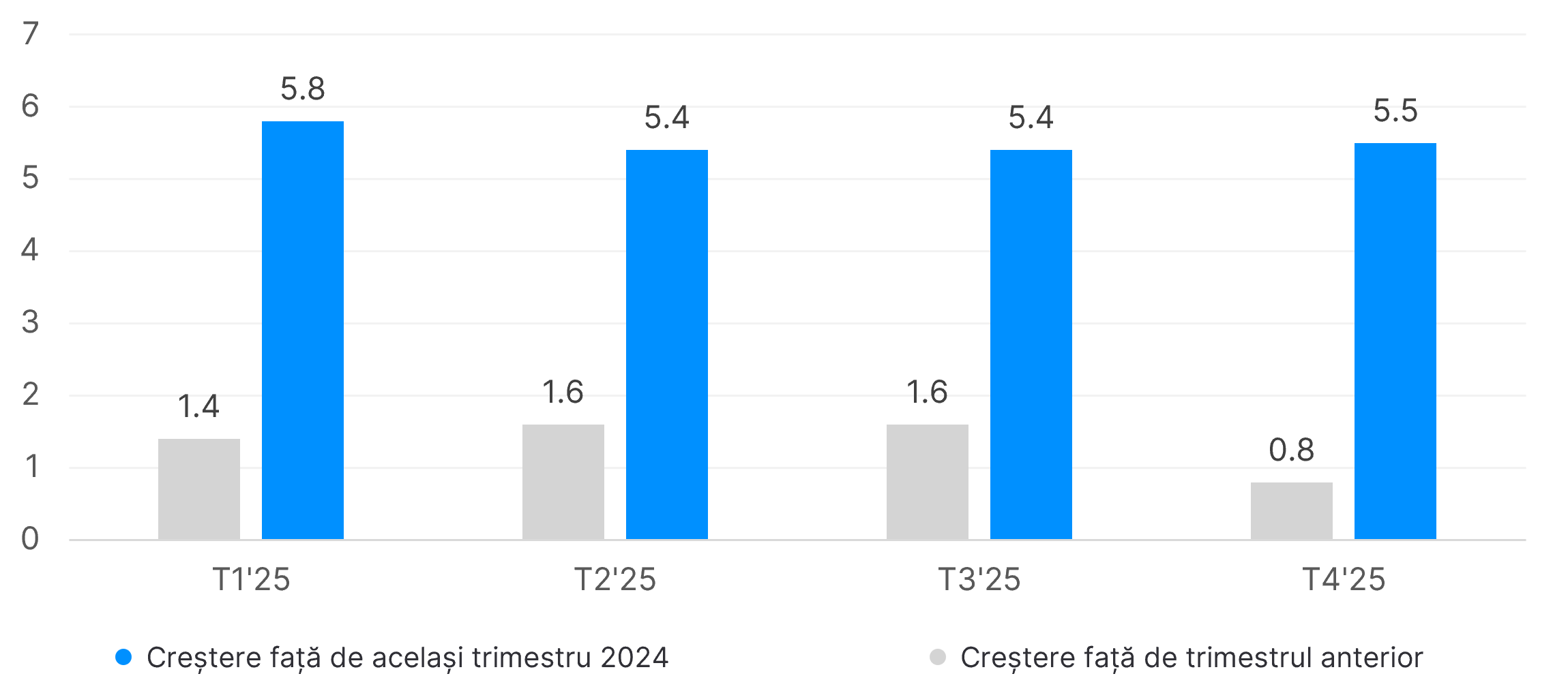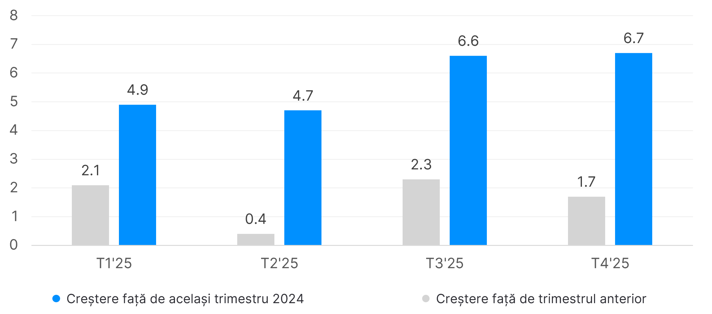- У другій половині року річний темп зростання Румунії, що становив 6,6 % та 6,7 %, перевищив середній показник ЄС, який склав 5,4 % та 5,5 %, що свідчить про відносне прискорення розвитку румунського ринку.